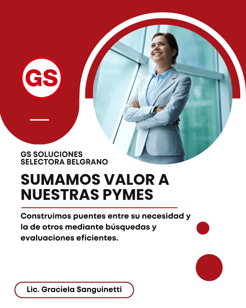 La Lic. Graciela Sanguinetti, reconocida por su impecable trayectoria de 40 años al servicio de empresas nacionales y corporaciones multinacionales, a través de «GS Soluciones Selectora Belgrano», su marca registrada, y habiendo sido distinguida por el Gobierno de la Ciudad de Buenos Aires, pone a su disposición sus conocimientos y expertise en la evaluación de perfiles laborales ejecutivos ofreciendo experiencias personalizadas y efectivas aplicadas a las necesidades de personal requeridas.